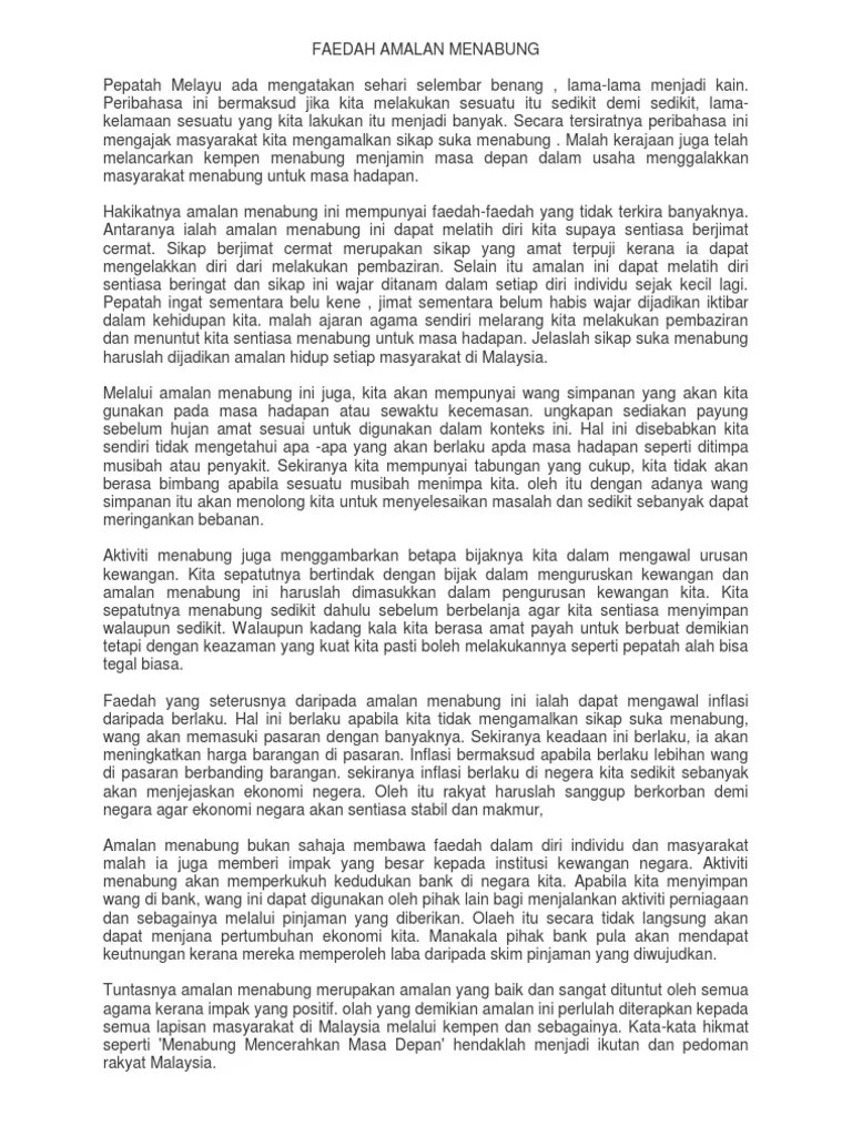 Karangan Upsr Kepentingan Amalan Menabung / Cara Cara Berjimat Cermat Ulasan. Apakah faedah menabung terhadap remaja? Wang ini boleh digunakan untuk kehidupan masa hadapan. Sesungguhnya menabung adalah amalan mulia dan banyak manfaatnya. Oleh itu, amalan menabung boleh dikatakan membawa faedah yang banyak kepada . Wang ini boleh digunakan untuk kehidupan masa hadapan. Sesungguhnya menabung adalah amalan yang mulia.